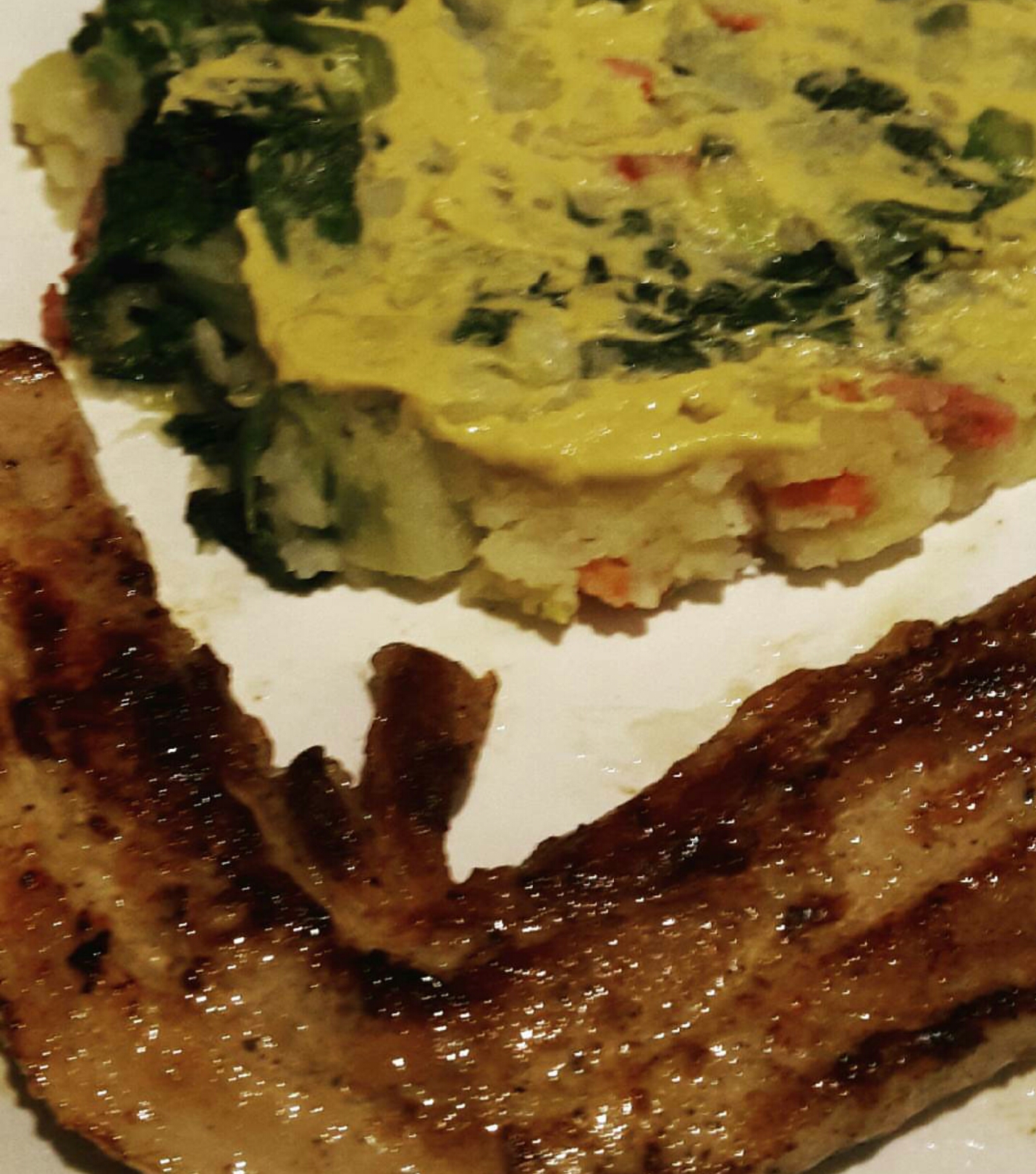 De stamppot heb ik gemaakt door wanneer de aardappelen net wel/niet gaar zijn de andijvie toe te voegen en nog even mee te laten koken. Afschudden en een scheutje lactosevrije melk toevoegen. Dan stampen met een stamper en de spekjes en wat peper erdoor. Mocht een stamper te zwaar zijn, mijn moeder gebruikt vaak de mixer om het fijn te maken. Een geluk hebben we wel bij het dieet; we mogen mosterd! 😍